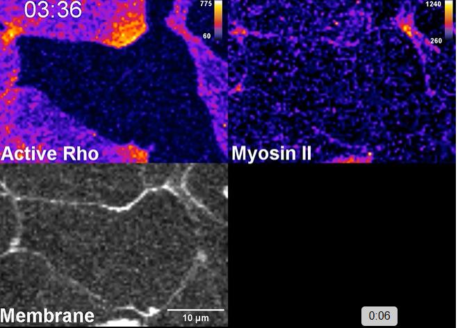 Video S1. Active Rho and myosin II accumulate near the cytokinetic furrow in neighbor cells, related to Figure 1A. Time-lapse confocal imaging of active Rho (GFP-rGBD, top left), Myosin II (Sf9-mCherry, top right), and membrane (CellMask Deep Red, bottom left) in cells neighboring a dividing cell. Lookup table scales are indicated as shown. Time shown in minutes:seconds. Playback at 10 fps. |
