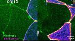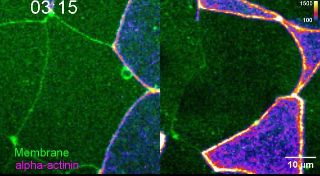 Video S3. ɑ-actinin overexpression in neighbor cells slows cytokinetic furrow ingression, related to Figure 2A. Time-lapse confocal imaging of GFP-ɑ-actinin (Fire lookup table) and cell membrane (CellMask Deep Red, green). Left: Dividing cell with one neighbor overexpressing ɑ-actinin at low level; Right: dividing cell with one neighbor overexpressing ɑ-actinin at high level. Lookup table scale is indicated as shown. Time shown in minutes:seconds. Playback at 10fps. |