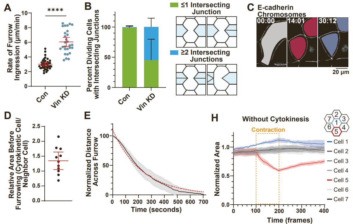 point represents one cell. Mean ± 95% CI is shown in red. E) Time to complete furrowing for cells