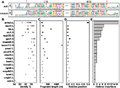 Fig. 2. Landscape of captured gene fragments within Helitron insertions. A Sequence logos of terminal sequences of LTS and RTS for nonautonomous Heli1Xen1 involving in gene capture events. Red arrows on top of the graph indicate the pattern of Helitron insertion sites. B Nucleotide identity between the donor gene and captured fragments. C Length of captured CDS fragments by Helitron sequences. D Relative start position of captured fragments within the donor gene, zero corresponds to the 5’ end of the CDS and 0.8 to the 3’ end. E Number of Helitron insertions that contain the gene fragments