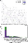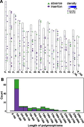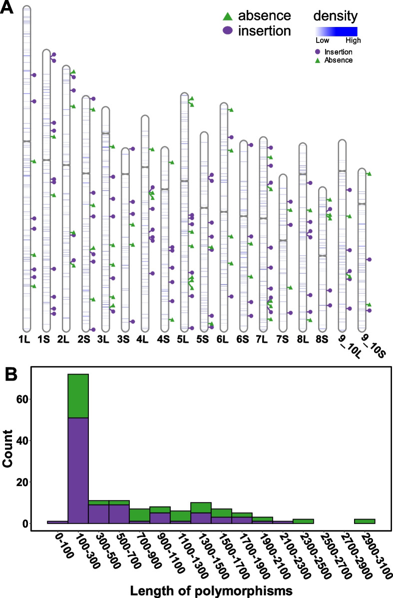 Fig. 4. Heli1Xen1 polymorphism in X. laevis genomes. A Heli1Xen1 polymorphism distribution across chromosomes of X. laevis. The blue bar represents the density of Heli1Xen1 insertions every 100 kbp window in the X. laevis reference genome. Dots in purple represent the insertion of Heli1Xen1 in the outbred genomes. Green triangles represent the absence of Heli1Xen1 in the outbred genomes. B The histogram shows the frequency of detected Heli1Xen1 polymorphisms according to their length expressed in bp
