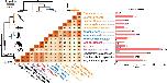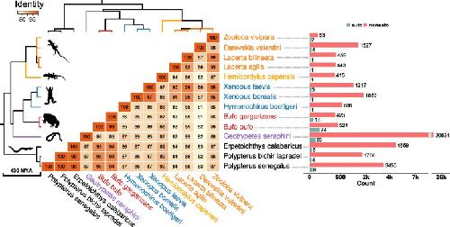 Fig. 5. Heli1Xen1 sequences in vertebrates. The heatmap (left) shows the pairwise identity of Heli1Xen1 RepHel consensus sequences from the different vertebrates where it was found. Each cell indicates the percentage of nucleotide identity. The bar plot (right) shows the number of autonomous and non-autonomous Heli1Xen1 insertions in each vertebrate genome. The phylograms on the left and the top of the heatmap are based on Time Tree database