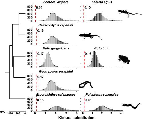 Fig. 7. Histogram of the Kimura substitution distribution between orthologous genes of X. laevis and other vertebrates. The red dotted line indicates the Kimura substitutions between Heli1Xen1 from X. laevis and each vertebrate genome