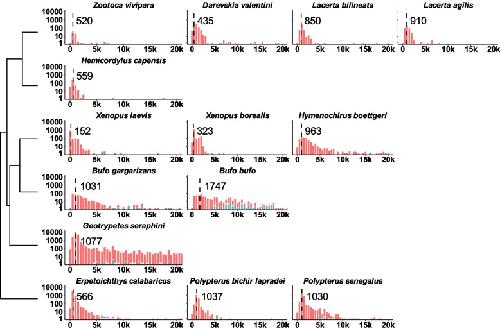 Fig. 8. Length distribution of Heli1Xen1 insertions in different species genomes. Non-autonomous insertions are shown in red, and autonomous insertions in blue. Species are ordered based on their phylogeny relationship. The X-axis represents the insertions' length (bp), and the Y-axis represents the number of insertions log10-adjusted. The dotted line represents the peaks of size distribution