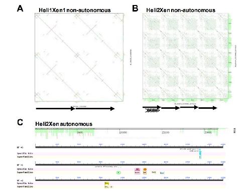 element. Arrows correspond to the duplicated Heli1Xen1 insertion. (B) Dotplot of the