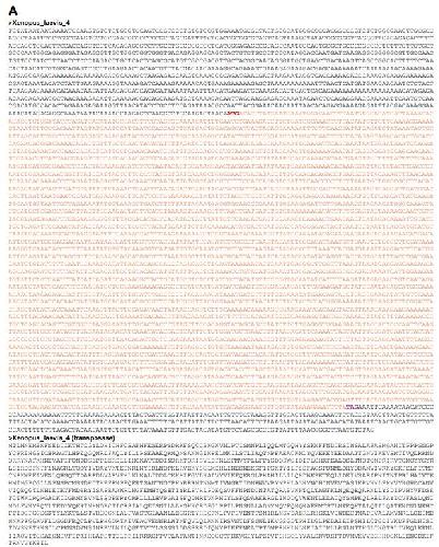 codon is highlighted in red, and the stop c odon in purple. (B) Scheme shows the