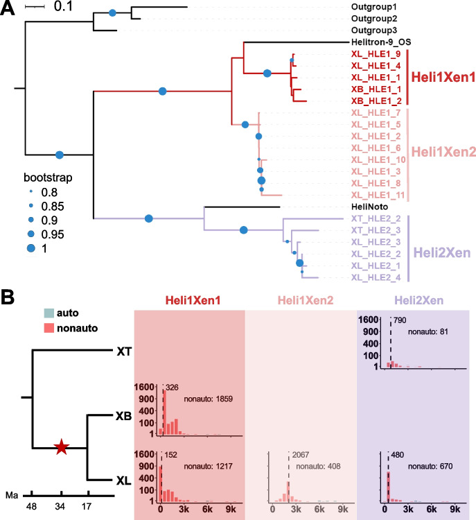 Fig. 1. Helitron distribution in the genome of Xenopus frogs. A Phylogenetic tree of Xenopus Helitron transposases. The HeliNoto (from the fish Chionodraco hamatus) and Helitron- 9_OS (from the plant Oryza sativa) were chosen as positive controls because they are known autonomous Helitron2 and Helitron1 sequences from Repbase. Outgroup1 - 3 are three outgroup sequences. B Distribution of non-autonomous Helitrons in three Xenopus frogs. Frequency along the y-axis of Helitron insertions according to their length (x-axis, in bp). XT: X. tropicalis; XB: X. borealis; XL: X. laevis. The y-axis is square root adjusted. The star in red represents the WGD event that happened ~ 34 mya