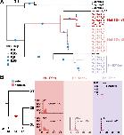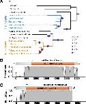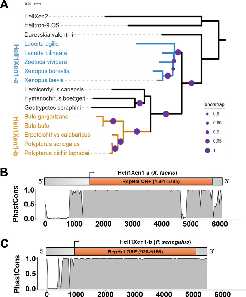 Fig. 6. Classification of homologous HeliXen1 sequences across vertebrates. A Phylogenetic relationships of HeliXen1 RepHel sequences from different vertebrates. Heli1Xen1-a and Heli1Xen1-b are highlighted in different colours. Heli1Xen2 and Helitron- 9_OS are used as the outgroup. B-C Plots show the PhastCons score across Heli1Xen1-a (B) and Heli1Xen1-b (C) consensus sequences from X. laevis and Polypterus senegalus (a ray-finned fish), respectively. The position of RepHel ORF is highlighted in red