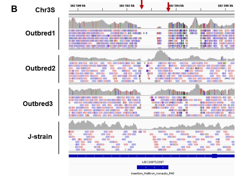 absence in outbred frogs and presence in J-strain (inbred). The reads for J-strain are