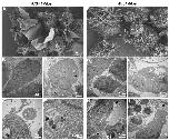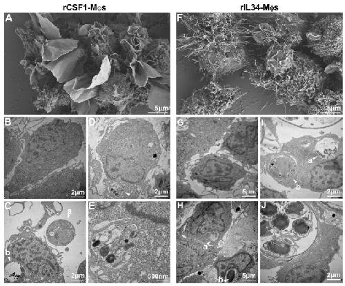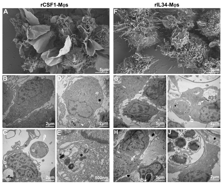 Figure 2. Scanning and transmission electron microscopy images of (A–E) CSF1- and (F–J) IL34-Mϕs. CSF1- and IL34-Mϕs were incubated alone (A,B and F,G, respectively) or with developing Bd thalli (C–E and H–J, respectively) for 5 h (5 Bd/Mϕ) before preparation and electron microscopy analyses. (A) SEM of CSF1-Mϕs. (B) TEM of CSF1-Mϕs. (C) TEM of CSF1-Mϕs co-incubated with Bd. Arrows: (a) non-phagocytosed zoosporangium; (b) phagocytosed and degraded zoosporangium. (D) TEM of CSF1-Mϕs co-incubated with Bd. Arrows: phagocytosed zoosporangium. (E) Higher magnification of zoosporangium-containing phagosome in (D). (F) SEM of IL34-Mϕs. (G) TEM of IL34-Mϕs. (H) TEM of IL34-Mϕs co-incubated with Bd. Arrows: (a) phagocytosed Bd zoospore in the process of being degraded; (b) phagocytosed zoospore. (I) TEM of IL34-Mϕs co-incubated with Bd. Arrows: (a) phagocytosed, degraded zoosporangium; (b) phagocytosed zoosporangium. (J) Higher magnification of mature zoosporangium-containing phagosome.