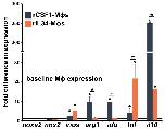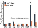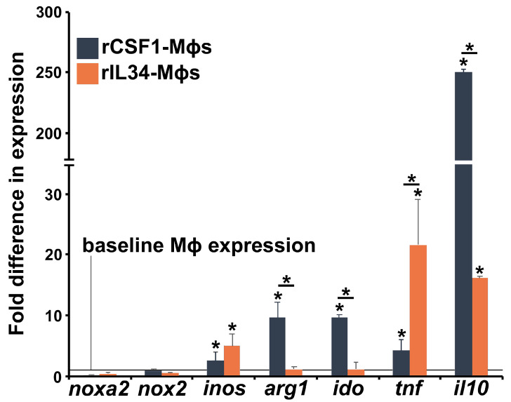Figure 3. Consequences of Bd exposure on CSF1- and IL34-Mϕ activation. CSF1- and IL34-Mϕs were incubated with developing Bd thalli for 5 h (5 Bd/Mϕ), and the cocultures were examined for their expression of immune genes relative to gapdh endogenous control. All data are represented relative to parallel respective CSF1- and IL34-Mϕ cultures, incubated without Bd, depicted by the horizontal line. The results are means ± SEMs of immune gene expression from 6 independent CSF1- and IL34-Mϕ cultures, derived from 6 individual frogs, N = 6. Asterisks above bars indicate statistical significance between baseline and Bd-elicited Mϕ gene expression, and asterisks above lines are indicative of statistical differences between the treatment groups denoted by the lines, p < 0.05. The examined frog Mϕ genes included noxa2 and nox2-NADPH oxidase catalytic domains; inos—inducible nitric oxide synthase; arg1—arginase-1; ido—indoleamine 2,3 dioxygenase; tnf—tumor necrosis factor, and il10—interleukin-10.