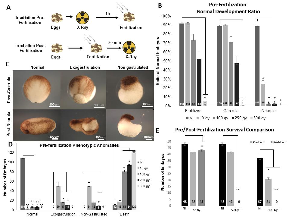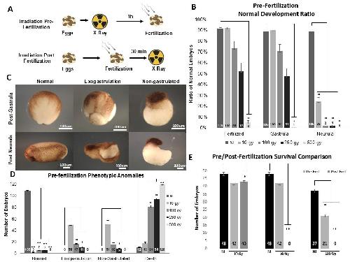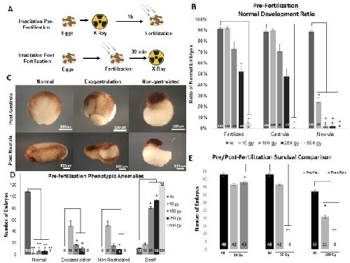 We examined the effects of X-ray irradiation on Xenopus laevis , focusing on pre- and post-fertilization exposure. We applied X-ray doses of 10, 50, 100, 250, and 500 Gy. Fifty percent of the 360 eggs irradiated at 250 Gy failed to fertilize, while fertilized eggs developed normally until the gastrula stage. Doses ranging from 10 to 250 Gy caused developmental anomalies. High mortality rates were observed at doses of 100 to 500 Gy. Post-fertilization irradiation at 50 to 100 Gy resulted in 100% lethality, while exposure to 10 Gy led to only 13% lethality, although both exposure levels produced similar types of developmental anomalies compared to pre-fertilization irradiation. This study highlights how the timing and intensity of exposure critically affect embryo viability, especially during the sensitive stages of fertilization and gastrulation. We establish the necessary and sufficient dosage to further investigate the molecular mechanisms of X-ray damage to DNA and protein.