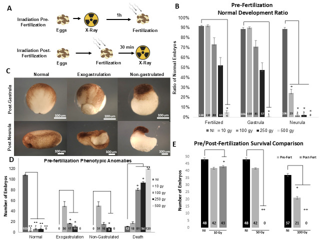 X-Ray Impact on Xenopus laevis development pre- and post- fertilization. (A) Two alternative experimental designs: irradiation pre- and post-fertilization. (B) Bar plot of the average normal development of eggs irradiated with 10, 100, 250, and 500 Gy pre-fertilization. P values: t-test, n=3, with 120 eggs per condition in triplicates from 3 different females (total 360 per condition). Conditions significantly decreased compared to control (*: two-tailed paired t-test P < 0.05). (C) Sample embryos illustrate the phenotype classes observed during X-ray exposure: normal, exogastrulation, non-gastrulation, and death. (D) Distribution of phenotypes observed in C for different pre-fertilization X-ray exposures. P values: t-test, n=3, with 120 eggs per condition in triplicates from 3 different females (total 360 per condition). Conditions significantly decreased compared to control (*: two-tailed paired t-test P < 0.05; **: t-test P < 0.001). Subfigures B and D show quantification from two independent experiments. (E) Average survival of late neurula embryos from pre- and post-fertilized irradiated groups at 10, 50, and 100 Gy. Each group started with 50 initial eggs or zygotes in triplicates per condition of two independent females (300 embryos per condition tested). P values: t-test, n=2 of 150 embryos per condition. Conditions significantly decreased compared to control (*: two-tailed paired t-test P < 0.05; **: t-test P < 0.001).