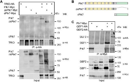 Fig. 2. TRIO interacts with Ptk7 in HEK293 cells. (A-C) HEK293 cells were transfected as indicated and immunoprecipitations were performed using anti-HA (A) or anti-Myc (C) antibodies. Ptk7 constructs used for immunoprecipitation are shown in B. (A,C) Co-immunoprecipitated proteins are shown in the upper panel, immunoprecipitated proteins in the middle panel and cell lysates in the bottom panel. Antibodies used for western blotting and molecular weights (kDa) are indicated on the right. Representative results of at least three independent experiments are shown. |