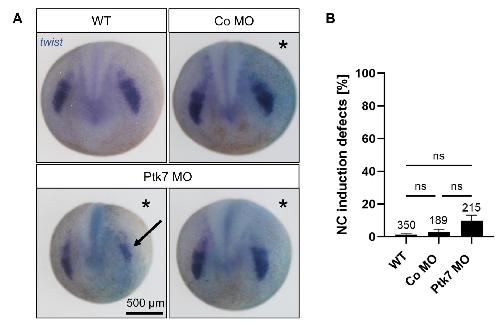 Fig. S1. Ptk7 loss-of-function does not affect NC induction. Two-cell stage embryos were injected with 7.5 ng Ptk7 MO or a control MO in combination with 75 pg lacZ RNA as lineage tracer. (A) NC cell induction was analyzed at stage 17/18 by twist in situ hybridization. Asterisks mark the injected side. Arrow indicates NC induction defect. Scale bar: 500 μm. (B) Graph showing NC induction defects of four independent experiments. The total number of embryos is indicated for each column. Data are mean ±s.e.m., ns = not significant (one- way ANOVA). |