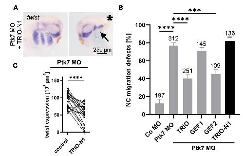 Fig. S2. TRIO-N1 does not rescue NC migration in Ptk7 morphants. Two- cell stage embryos were injected with 6.5-7.5 ng Ptk7 MO or a control MO in combination with 75 pg lacZ RNA as lineage tracer. Co-injection of 150 pg TRIO DNA and 100 pg GEF2 RNA, but not 100 pg GEF1 RNA or 100 pg TRIO-N1 DNA, restored NC cell migration in Ptk7 morphants. The data shown here include the data already shown in Fig. 1. (A) NC cell migration was analyzed at stage 26 by twist in situ hybridization. Asterisks mark the injected side. Arrow indicates NC migration defects. Scale bar: 250 μm. (B) Graph summarizing the percentage of embryos with NC migration defects of at least three independent experiments. The total number of embryos is indicated for each column. Data are mean ±s.e.m. **** p<0.0001, ***p<0.001 (one-way ANOVA). (C) Quantification of the twist in situ hybridization shown in (A). Graph presenting the measured area of twist expression of 20 randomly selected embryos of the rescue condition using TRIO-N1. The twist expression of the uninjected side (control) is compared to that of the injected side of the embryo. **** p<0.0001 (paired t-test).