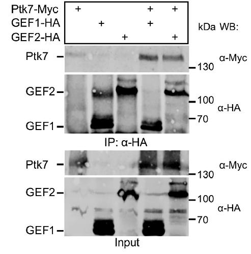 Fig. S3. The Trio GEF domains interact with Ptk7 in HEK293 cells. HEK293 cells were transfected as indicated and immunoprecipitations were performed using an anti-HA antibody. Co-immunoprecipitated proteins are shown in the upper panel, immunoprecipitated proteins in the middle panel and cell lysates in the bottom panel. Antibodies used for Western blotting and molecular weights (kDa) are indicated on the right. Representative results of at least three independent experiments are shown. |