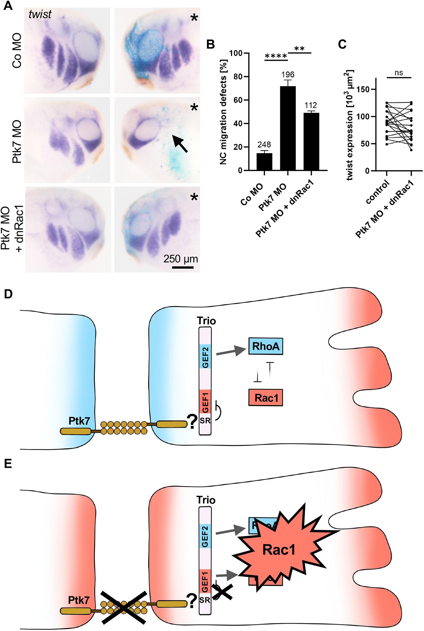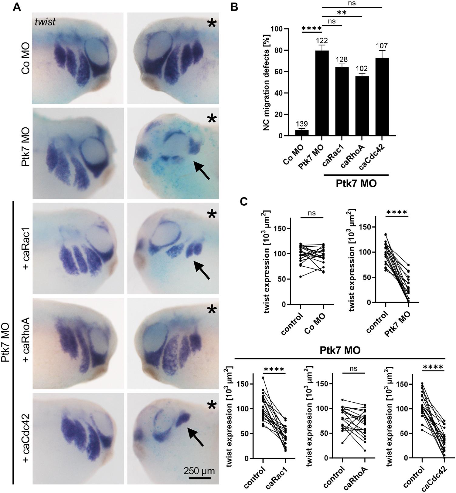 Fig. 5 Activation of RhoA rescues the Ptk7 morphant phenotype. (A-C) Embryos were injected with 5 ng control MO or 5 ng Ptk7 MO alone or together with 10 pg caRac1, caRhoA or caCdc42 DNA in combination with 50 pg lacZ RNA as a lineage tracer in one blastomere at the eight-cell stage. (A) NC cell migration was analyzed at stage 26 by twist in situ hybridization. Co-injection of caRhoA rescued NC migration in Ptk7 morphants. The injected side is marked with an asterisk. Arrows indicate NC cell migration defects. Scale bar: 250 µm. (B) Graph showing the percentage of embryos with NC migration defects of at least three independent experiments. The total number of embryos is indicated for each column. Data are mean±s.e.m. ****P<0.0001, **P<0.01; ns, not significant (one-way ANOVA). (C) Graphs presenting the measured area of twist expression of 20 randomly chosen embryos per condition. Lower panels show the results of embryos co-injected with Ptk7 MO and the respective rescue constructs. The twist expression of the uninjected side (control) is compared to the injected side of the embryo. ****P<0.0001; ns, not significant (paired t-test).