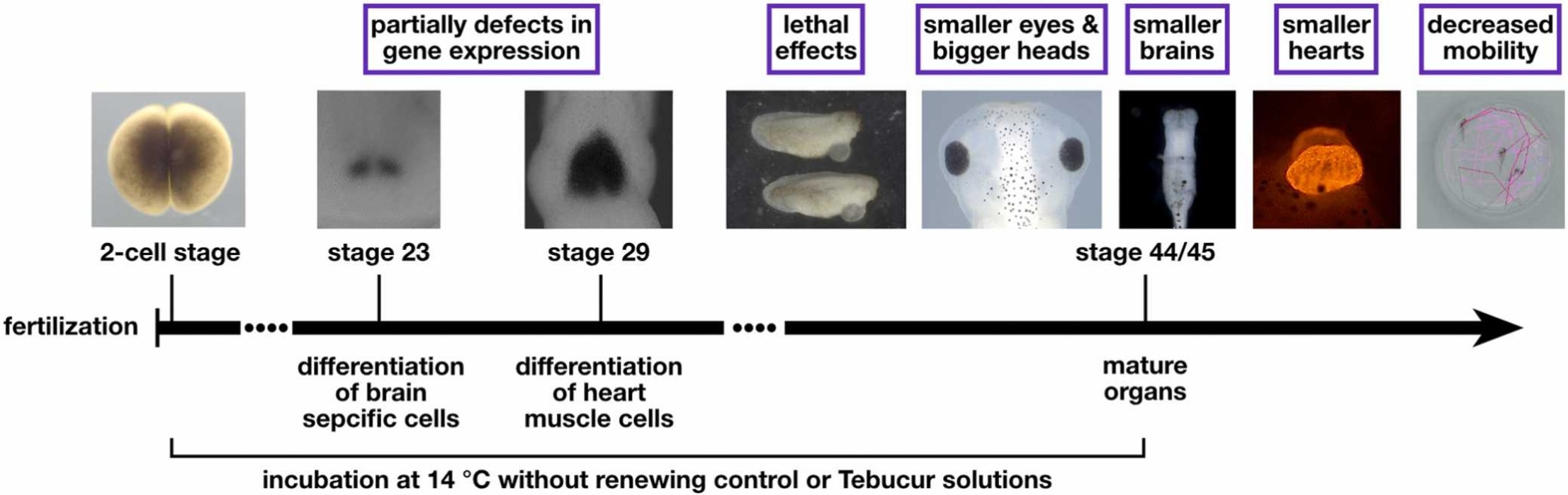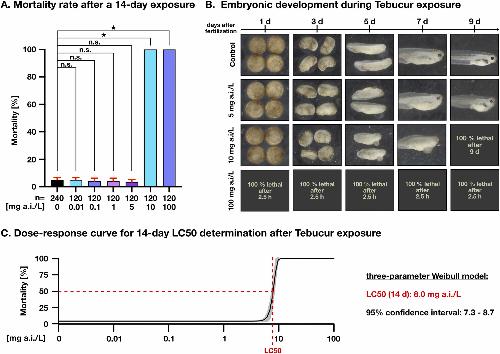 Fig. 1. Impact of Tebucur on mortality and embryonic development of X. laevis. A. Mortality rate after a 14-day exposure to Tebucur. Statistical analysis of mortality after 14-day exposition to Tebucur (0.01, 0.1, 1, 5, 10, 100mg a.i/L) compared to non-exposed embryos at stage 44/45 (N=4, n=120140). Tebucur significantly increased mortality at 10 and 100mg a.i./L. B. Embryonic development during Tebucur exposure. Representative time-series images of X. laevis embryos incubated in different concentrations of Tebucur (5, 10, 100mg a.i./L), showing early mortality from 10mg a.i./L compared to control embryos. C. Dose-response curve for 14-day LC50 determination after Tebucur exposure. To determine the LC50 value after 14-day exposure to Tebucur, a three-parameter Weibull model was used. The calculated LC50-value at 336h (14 days) was 8.0mg a.i./L (95% CI: 7.38.7). Abbreviations: d: days, h: hours, mg a.i./L: milligram active ingredient (tebuconazole) per liter, LC50: lethal concentration 50; CI: 95% confidence interval; n: number of evaluated embryos in total, n.s.: not significant. |