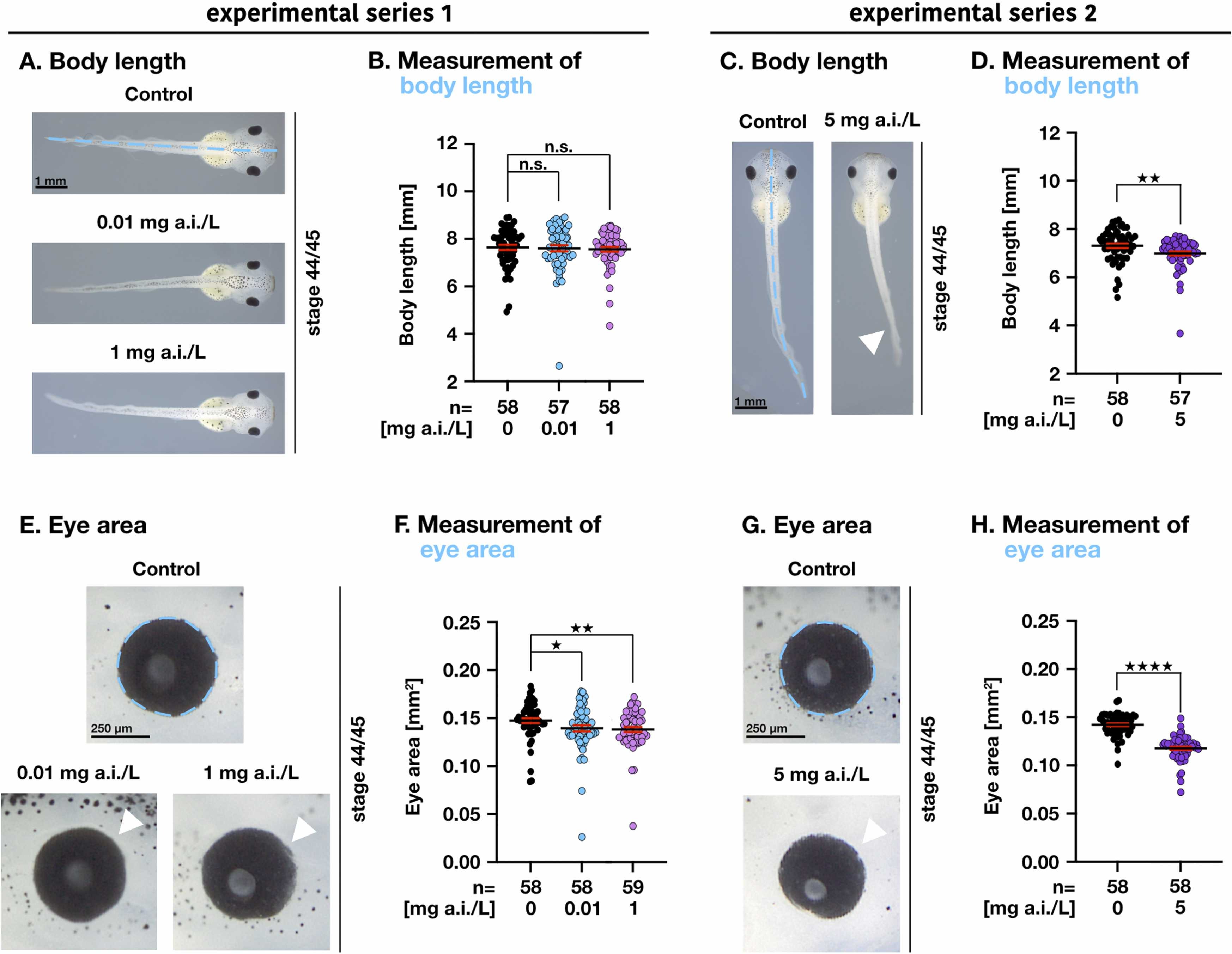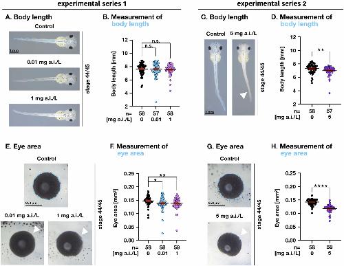 Fig. 2. Morphological alterations of X. laevis embryos after a 14-day exposure to Tebucur. A. Body length. Dorsal images of embryos at stage 44/45 (control, 0.01, 1mg a.i./L). B. Measurement of body length. Statistical analysis of head to tail length (blue dotted line in A) of embryos treated with control solution and 0.01, 1mg a.i./L Tebucur (N=2, n=5758). C. Body length. Dorsal images of embryos at stage 44/45 (control and 5mg a.i./L). D. Measurement of body length. Statistical analysis of head to tail length (blue dotted line in C) of embryos treated with control solution and 5mg a.i./L (N=2, n=5758). Exposure to 5mg a.i./L Tebucur led to significantly reduced body length (white arrow in C). E. Eye area. Lateral images of embryos at stage 44/45 (control, 0.01, 1mg a.i./L). F. Measurement of eye area. Statistical analysis of eye area (blue dotted line in E) of embryos treated with control solution and 0.01, 1mg a.i./L Tebucur (N=2, n=5859). After treatment a significant reduction in eye area was observed (white arrows in E). G. Eye area. Lateral images of embryos at stage 44/45 (control and 5mg a.i./L). H. Measurement of eye area. Statistical analysis of eye area (blue dotted line in G) of embryos treated with control solution and 5mg a.i./L Tebucur (N=2, n=58). Exposition to 5mg a.i./L Tebucur led to a significant decrease in eye area (white arrow in G). Abbreviations: mg a.i./L: milligram active ingredient (tebuconazole) per liter, mm: millimeter, mm2: square millimeter, n: number of evaluated embryos in total, n.s.: not significant, m: micrometer. |