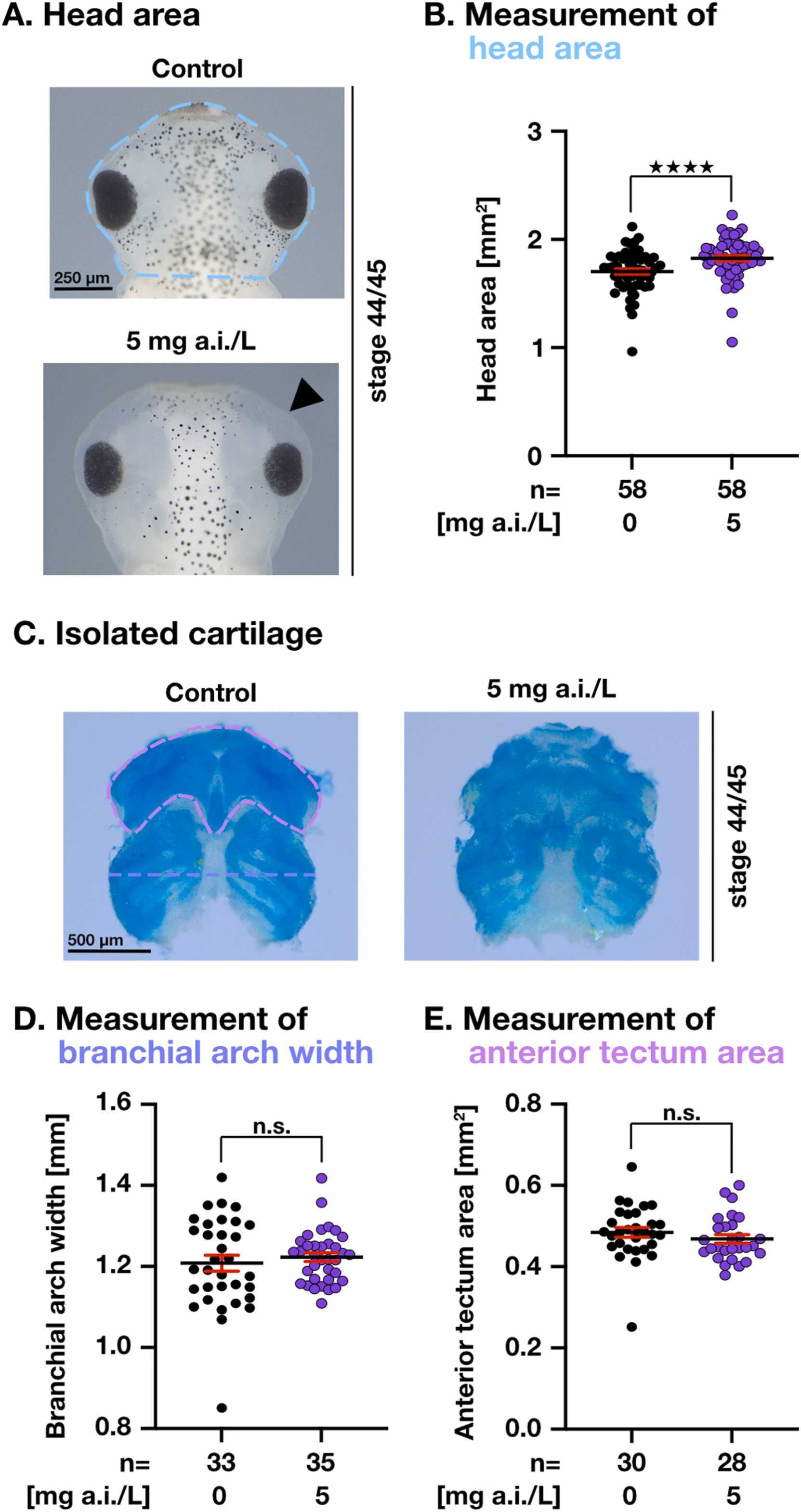 Fig. 3. Influence of Tebucur on head area and cranial cartilage of X. laevis embryos. A. Head area. Dorsal images of X. laevis embryos at stage 44/45 (control and 5mg a.i./L). B. Measurement of head area. Statistical analysis of head area (blue dotted line in A) of embryos treated with control solution and 5mg a.i./L Tebucur (N=2, n=58). Exposure to 5mg a.i./L Tebucur led to a significant increase in head area (black arrow in A). C. Isolated cartilage. Ventral images of cranial carti of X. laevis embryos at stage 44/45 (control and 5mg a.i./L). D. Measurement of branchial arch width. Statistical analysis of branchial arch width (lilac dotted line in C) of embryos treated with control solution and 5mg a.i./L Tebucur (N=2, n=3335). E. Measurement of anterior tectum area. Statistical analysis of anterior tectum area (pink dotted line in C) of embryos treated with control solution and 5mg a.i./L Tebucur (N=2, n=2830). Abbreviations: mg a.i./L: milligram active ingredient (tebuconazole) per liter, mm: millimeter, mm2: square millimeter, n: number of evaluated embryos in total, n.s.: not significant, m: micrometer. |
