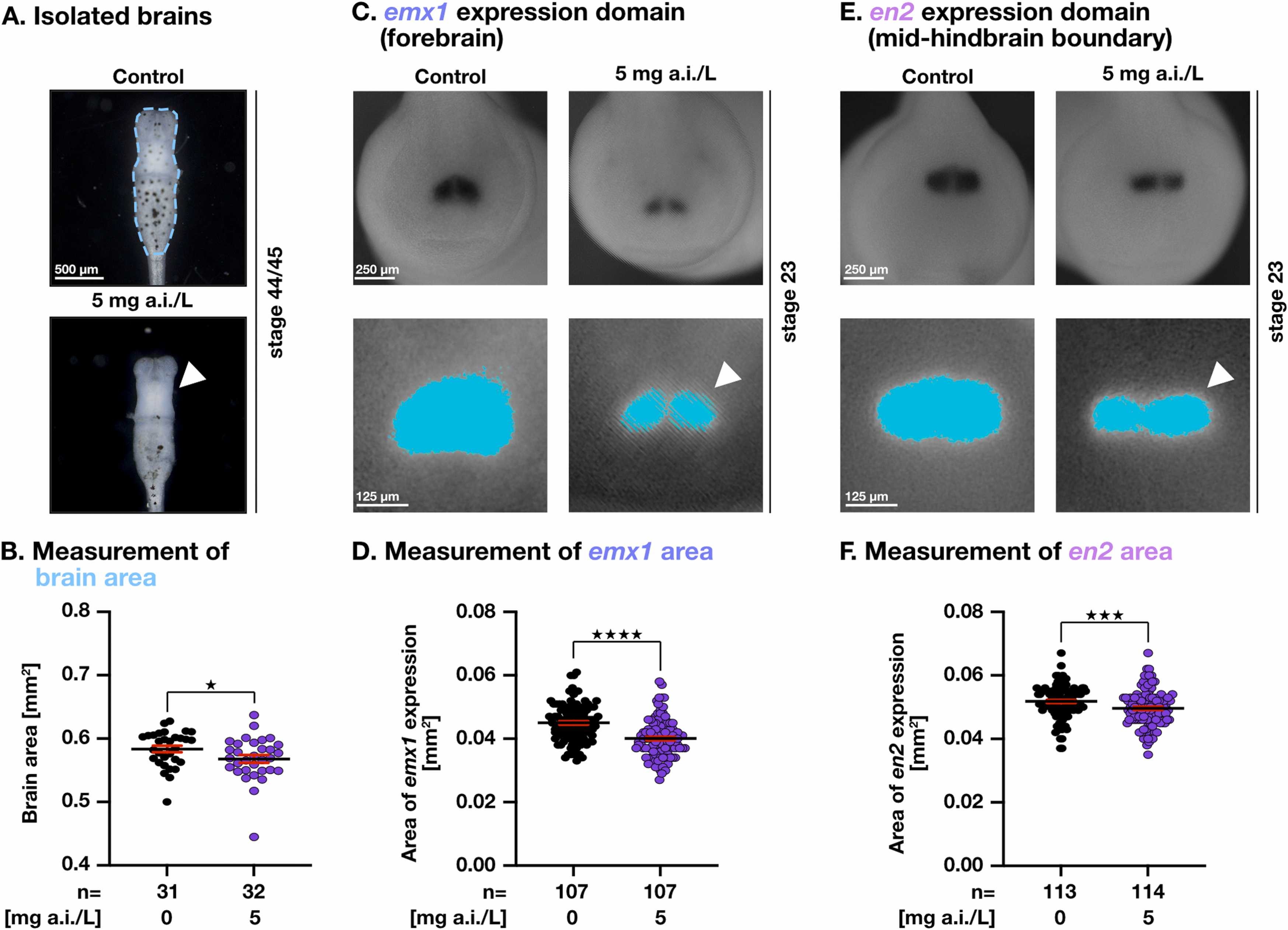 Fig. 4. Disruption of neural development of X. laevis embryos after Tebucur exposure. A. Isolated brains. Dorsal images of isolated X. laevis brains at stage 44/45 (control and 5mg a.i./L). B. Measurement of brain area. Statistical analysis of brain area (blue dotted line in A) of embryos treated with control solution and 5mg a.i./L Tebucur (N=2, n=3132). Exposure to 5mg a.i./L Tebucur led to a reduction in brain area (white arrow in A). C. emx1 expression domain (forebrain). Anterior images of forebrain-development gene emx1 expression domain (upper row: overview; lower row: area in blue) at stage 23 (control and 5mg a.i./L). D. Measurement of emx1 area. Statistical analysis of emx1 expression domain area (blue area in C) of embryos treated with control solution and 5mg a.i./L Tebucur (N=4, n=107). The emx1 expression domain area was significantly smaller after Tebucur treatment (white arrow in C). E. en2 expression domain (mid-hindbrain boundary). Anterior images of mid-hindbrain-development gene en2 expression domain (upper row: overview; lower row: area in blue) at stage 23 (control and 5mg a.i./L). F. Measurement of en2 area. Statistical analysis of en2 expression domain area (blue area in E) of embryos treated with control solution and 5mg a.i./L Tebucur (N=4, n=113114). Exposure to 5mg a.i./L Tebucur led to a significant reduction in en2 expression domain area (white arrow in E). Abbreviations: emx1: empty spiracles homeobox 1, en2: engrailed homeobox 2, mg a.i./L: milligram active ingredient (tebuconazole) per liter, mm2: square millimeter, n: number of evaluated embryos in total, m: micrometer. |
