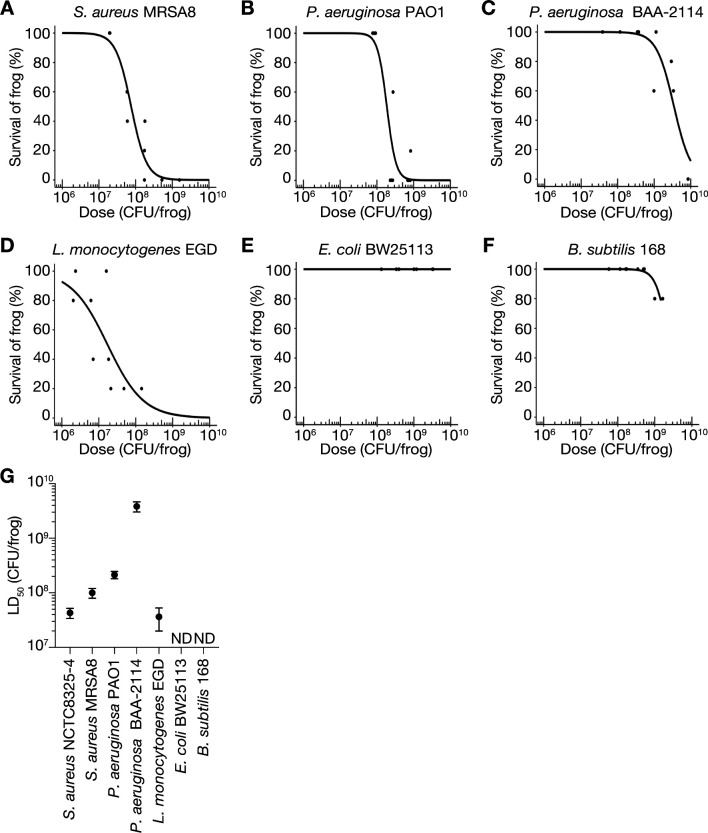 Fig 2. Various species of human pathogenic bacteria induce mortality in Xenopus frogs. (A–F) Dose-response survival curves of frogs injected intraperitoneally with S. aureus MRSA8 (A), P. aeruginosa PAO1 (B), P. aeruginosa BAA-2114 (C), L. monocytogenes EGD (D), E. coli BW25113 (E), and B. subtilis 168 (F) generated from the survival rate at 24 h post-injection. Five frogs were injected with three different concentrations of bacterial suspensions in a single experiment, and survival data obtained from at least three independent experiments are shown. (G) Based on the survival data (A–F), logistic regression analysis was performed using the statistical software R to determine LD50. Error bars indicate standard error. LD50 for NCTC8325-4 was calculated from the survival data in Fig. 1C. ND indicates not determined.