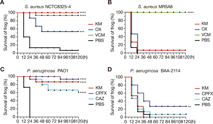 Fig 3. Antimicrobial agents inhibit bacterial infections in Xenopus frogs. Therapeutic effects of kanamycin (KM), oxacillin (OX), and vancomycin (VCM) on frogs injected with S. aureus NCTC8325-4 (A) and MRSA8 (B) were examined. Similarly, the effects of kanamycin (KM), ciprofloxacin (CPFX), and ceftazidime (CAZ) on frogs infected with P. aeruginosa PAO1 (C) and BAA-2114 (D) were examined. Immediately after intraperitoneal injection of bacterial suspensions, frogs were intraperitoneally administered with 50 µL of 2 mg/mL antimicrobial agent (100 µg/frog) or PBS, and survival was measured every 12 h. Five frogs were used per agent, and survival data were pooled from three independent experiments (n = 15). Significant differences between PBS- and antimicrobial-injected groups were determined using the log-rank test (**P < 0.01, ***P < 0.001, ****P < 0.0001).