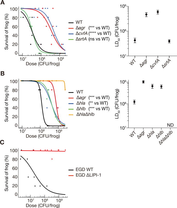 Fig 4. Deletion of bacterial virulence genes reduces bacterial killing activity against Xenopus frogs. (A) Comparison of the frog-killing abilities of S. aureus NCTC8325-4 strain (WT) and strains with deleted agr, srtA, and cvfA. (B) Comparison of the frog-killing abilities of NCTC8325-4 WT and strains with deleted agr, hla, hlb, and hla/hlb. (C) Comparison of the frog-killing ability of L. monocytogenes EGD (WT) and a strain with deleted LIPI-1. The data for L. monocytogenes EGD WT are the same as those presented in Fig. 2D. For all panels, bacterial suspensions were injected intraperitoneally into frogs, and survival was measured at 24 h post-injection. Five frogs were injected with each of three different concentrations of bacterial suspensions per strain in a single experiment. Dose-response survival curves were generated using logistic regression based on data from at least three independent experiments, and LD50 and standard error were calculated. Significant differences between gene-deleted and WT strains were determined using the likelihood ratio test (**: P < 0.01, ***: P < 0.001, ****: P < 0.0001). Error bars represent standard error.