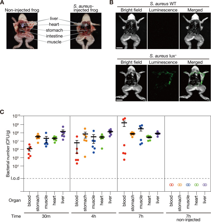 Fig 5. Bacteria disseminate from the intraperitoneal cavity to the whole body in Xenopus frogs. (A) Photograph of a Xenopus frog with its abdomen open. The left shows a non-injected frog. The right shows a frog that died 7 h after intraperitoneal injection of S. aureus NCTC8325-4 strain (8.6 × 108 CFU/frog). (B) S. aureus NCTC8325-4 strain (WT) or NCTC8325-4 strain carrying pND50-gmkp1-lux was injected intraperitoneally into the frog, and the abdomen was opened 7 h post-injection to observe luminescence. Bright field (left), luminescence (center), and merged images (right) are displayed. Scale bar: 10 mm. The bacterial dose administered was 8.6 × 108 CFU/frog. (C) Xenopus frogs were intraperitoneally injected with S. aureus NCTC8325-4 strain (8.6 × 108 CFU/frog), and bacterial CFUs were quantified in blood and organs at 30 min, 4 h, and 7 h post-injection. At each time point, three animals were analyzed in a single experiment, and two independent experiments were performed (n = 6). Mean CFU count from six frogs at each time point is represented by a solid horizontal bar, with the error bar indicating standard error. Open symbols indicate data from PBS-injected control frogs (n = 2). A dashed line indicates a limit of detection (liver, stomach, and muscle, 1 × 103 CFU/g; heart, 4 × 103 CFU/g; blood, 2 × 102 CFU/g).