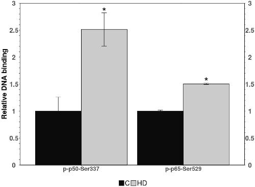 Fig. 3. Relative changes in DNA binding of NF-κB subunits, p-p65Ser529 and p-p50Ser337, in X. laevis liver nuclear extracts during control (C) and high dehydration (HD) as determined by ELISA. Data are mean ± SEM, n = 4 independent trials on tissue samples from different animals. Statistical significance was determined using a Student's t-test, where “∗” denotes significantly different from control values (p < 0.05).