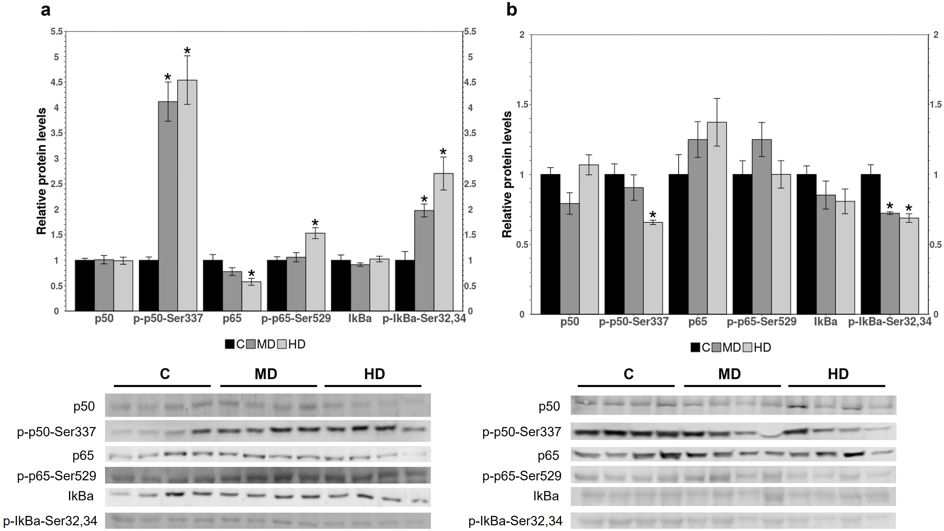 Fig. 1. Relative protein expression levels of NF-κB transcription factor subunits, p65 and p50, NF-κB inhibitor IκBα, and their phospho-forms, p-p65Ser529, p-p50Ser337, p-IκBαSer32,34, in Xenopus laevis (a) liver and (b) skeletal muscle during control (C), medium dehydration (MD), and high dehydration (HD) as determined by Western immunoblotting. Data are mean ± SEM, n = 4 independent trials on tissue samples from different animals. Statistical significance was determined using a one-way ANOVA with a Dunnett's post hoc test, where “∗” denotes significantly different from control values (p < 0.05). Corresponding bands from immunoblots are shown below each bar chart.