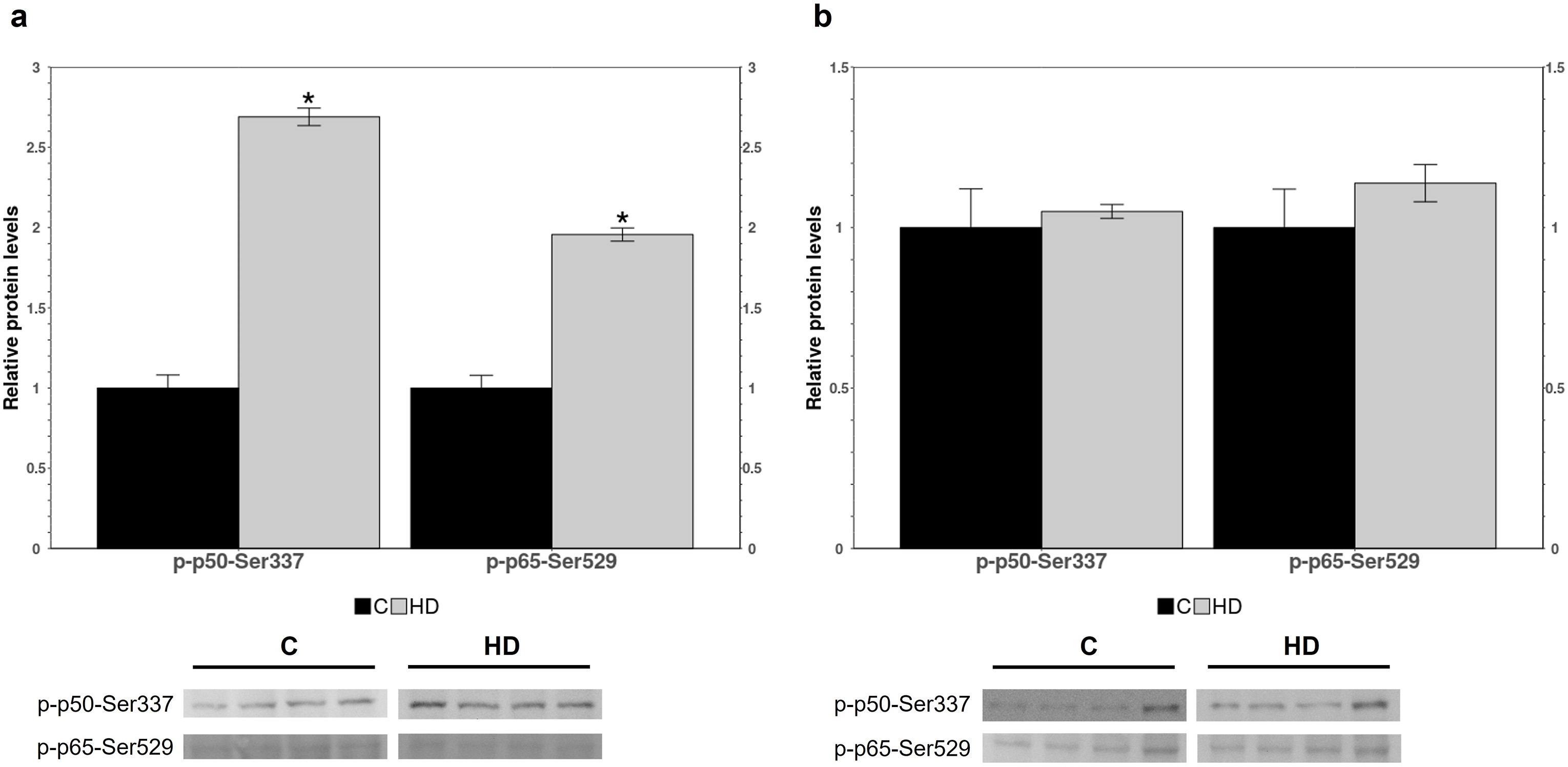 Fig. 2. Relative protein expression levels of p-p65Ser529 and p-p50Ser337 in X. laevis (a) liver and (b) skeletal muscle nuclear extracts during control (C) and high dehydration (HD) as determined by Western immunoblotting. Data are mean ± SEM, n = 4 independent trials on tissue samples from different animals. Statistical significance was determined using a Student's t-test, where “∗” denotes significantly different from control values (p < 0.05). Corresponding bands from immunoblots are shown below each bar chart.