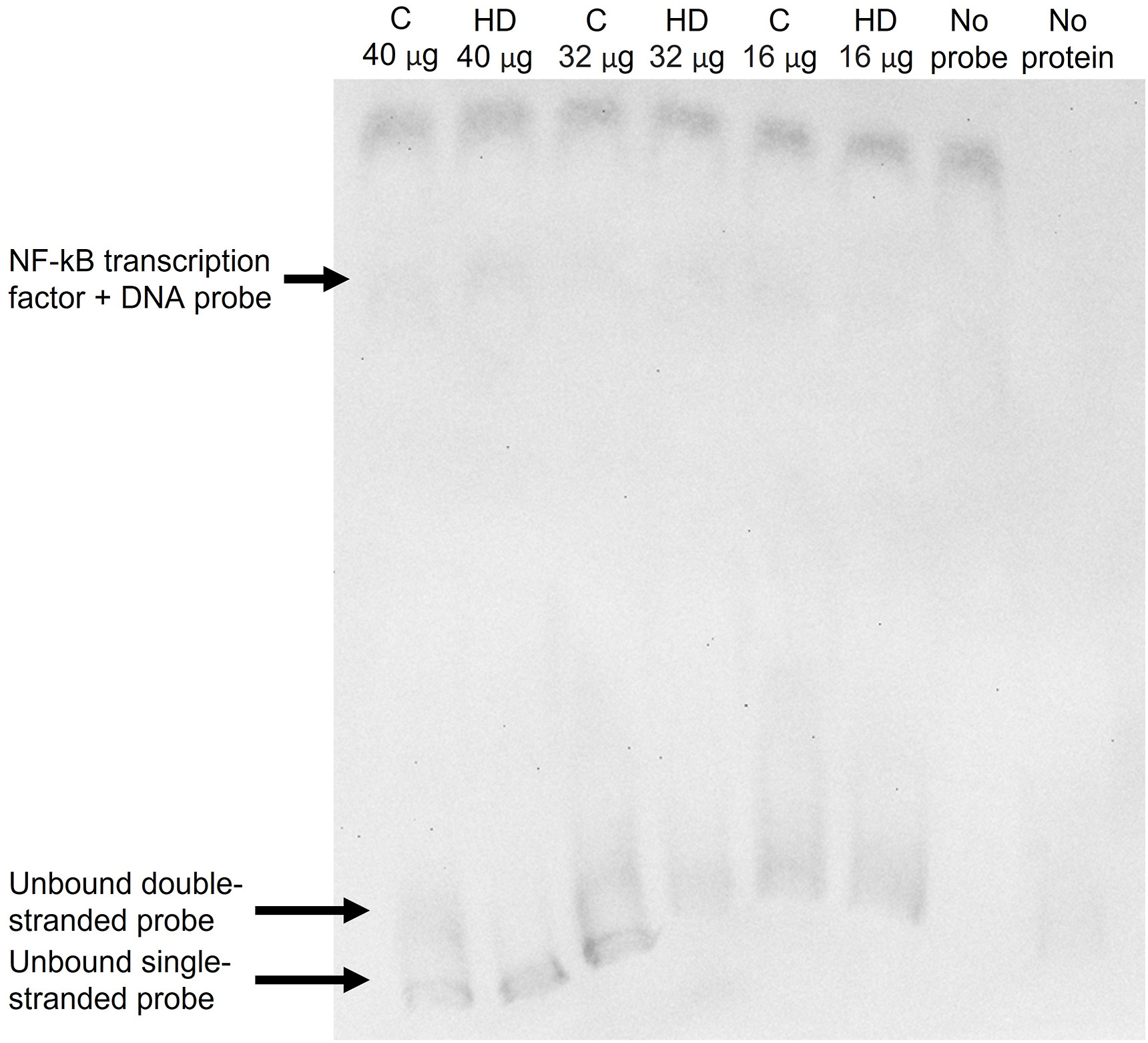 Fig. 4. Electrophoretic mobility shift assay (EMSA) gel run with different amounts (40 μg, 32 μg, 16 μg) of liver nuclear protein extract during control (C) and high dehydration (HD), showing the NF-κB transcription factor-DNA probe complex, and unbound double- and single-stranded probes.