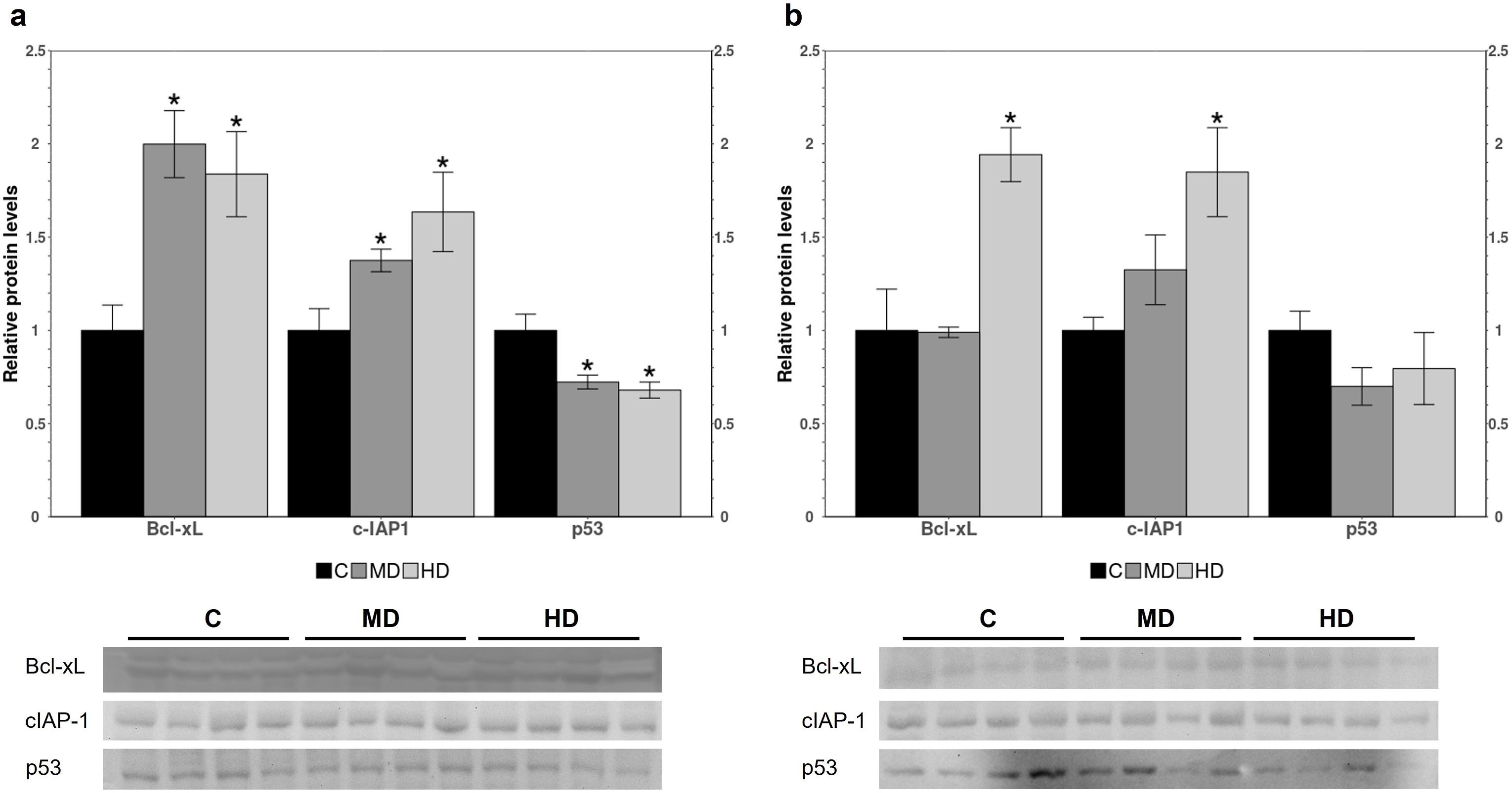 Fig. 6. Relative protein expression levels of NF-κB downstream targets; c-IAP1, Bcl-xL and p53 in X. laevis (a) liver and (b) skeletal muscle during control (C), medium hydration (MD), and high dehydration (HD) as determined by Western immunoblotting. Data are mean ± SEM, n = 4 independent trials on tissue samples from different animals. Statistical significance was determined using a one-way ANOVA with a Dunnett's post hoc test, where “∗” denotes significantly different from control values (p < 0.05). Corresponding bands from immunoblots are shown below each bar chart.