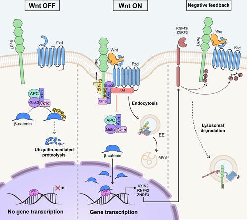Figure 1, General model of Wnt/β-catenin signaling. In absence of Wnt ligands, a destruction complex formed by Axin, APC, GSK3, and CK1 actively promotes β-catenin protein turnover through a proteasome-dependent mechanism, maintaining Wnt signaling in an OFF state. Conversely, in the Wnt ON state, a Wnt ligand binds to its cognate receptors, Fzd and Lrp5/6, inducing the formation of a multiprotein complex known as signalosome and inhibiting the destruction complex activity. The signalosome is subsequently endocytosed into early endosomes (EE), which later mature into multivesicular bodies (MVBs). Signalosome endocytosis is required to transduce the Wnt signal. Consequently, β-catenin protein is stabilized and translocates into the nucleus, where together with TCF/LEF it activates the transcription of Wnt target genes. Among genes activated by β-catenin/TCF, the transmembrane E3 ligases RNF43/ZNRF3 represent elements of an important negative feedback mechanism, which attenuate Wnt signaling by ubiquitination and degradation of the Fzd/Lrp5/6 receptor complex via the endolysosomal system. Note that, while Lrp6 stability is also regulated by RNF43/ZNRF3, it is still unclear whether it is directly ubiquitinated by the transmembrane E3 ligases |