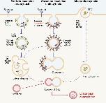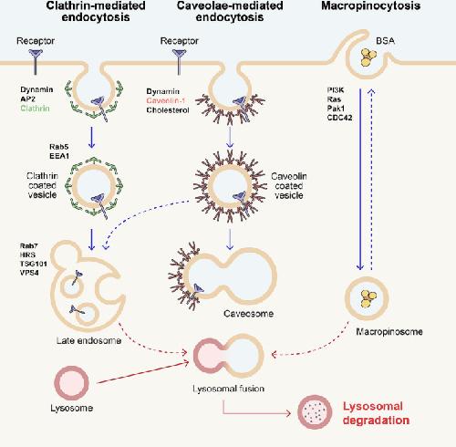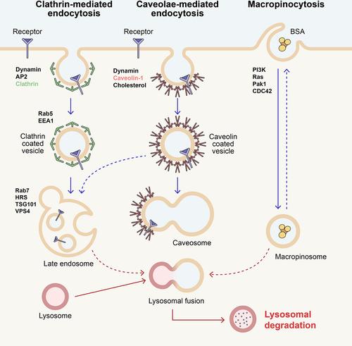Figre 3. Cellular mechanisms of endocytosis. The diagram shows clathrin-mediated endocytosis, caveolar endocytosis, and macropinocytosis, all of which have pertinence to Wnt signaling. The major regulatory proteins for the different endocytic processes are indicated. Although these pathways proceed through different mechanisms, they converge at the level of the late endosomal/lysosomal system. Note that macropinocytosis is a receptor-independent pathway, different from clathrin- and caveolin-dependent endocytosis |