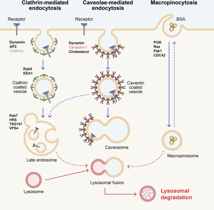 FIGURE 3. Cellular mechanisms of endocytosis. The diagram shows clathrin‐mediated endocytosis, caveolar endocytosis, and macropinocytosis, all of which have pertinence to Wnt signaling. The major regulatory proteins for the different endocytic processes are indicated. Although these pathways proceed through different mechanisms, they converge at the level of the late endosomal/lysosomal system. Note that macropinocytosis is a receptor‐independent pathway, different from clathrin‐ and caveolin‐dependent endocytosis |