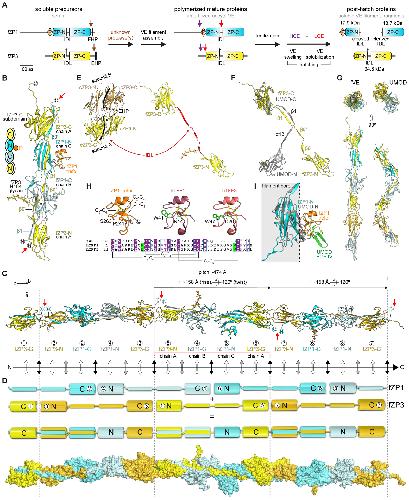(D) Schematic and surface representations of the egg coat filament shown in panel C. The top scheme shows each ZP module as a solid object, with thick cylinders representing ZP-N and ZP-C domains and thin cylinders depicting the two halves of the IDL; cylinder lengths approximately match the extent of the corresponding 3D structures in panel C and fZP1 P was omitted for clarity. To highlight how the IDLs of each subunit wrap around the ZP-C and ZP-N domains of the other, the fZP1 linker is shown as intact in the solid scheme and its cleaved moieties have been reconnected in silico in the surface model.