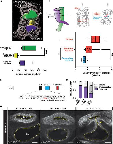 (B) Diagrams of the separating foregut at i) the intact bilayer and ii) at the point where the bilayer is separating. The graph quantifies Cdh1/mbGFP intensity at cell surfaces in the bilayer and the adherent vs. separating side of the cells losing contact (mean min/max, p < 0.01 1W-ANOVA, n = 5 cells per embryo, N=6 embryos).