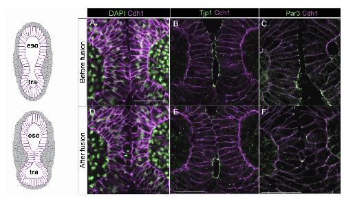 S2A-C: Before fusion the foregut is a pseudostratified epithelium with apical tight junctions (Tjp1) and Par3.