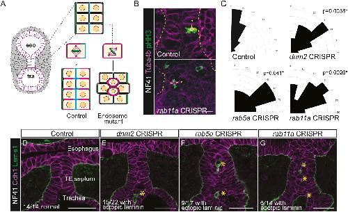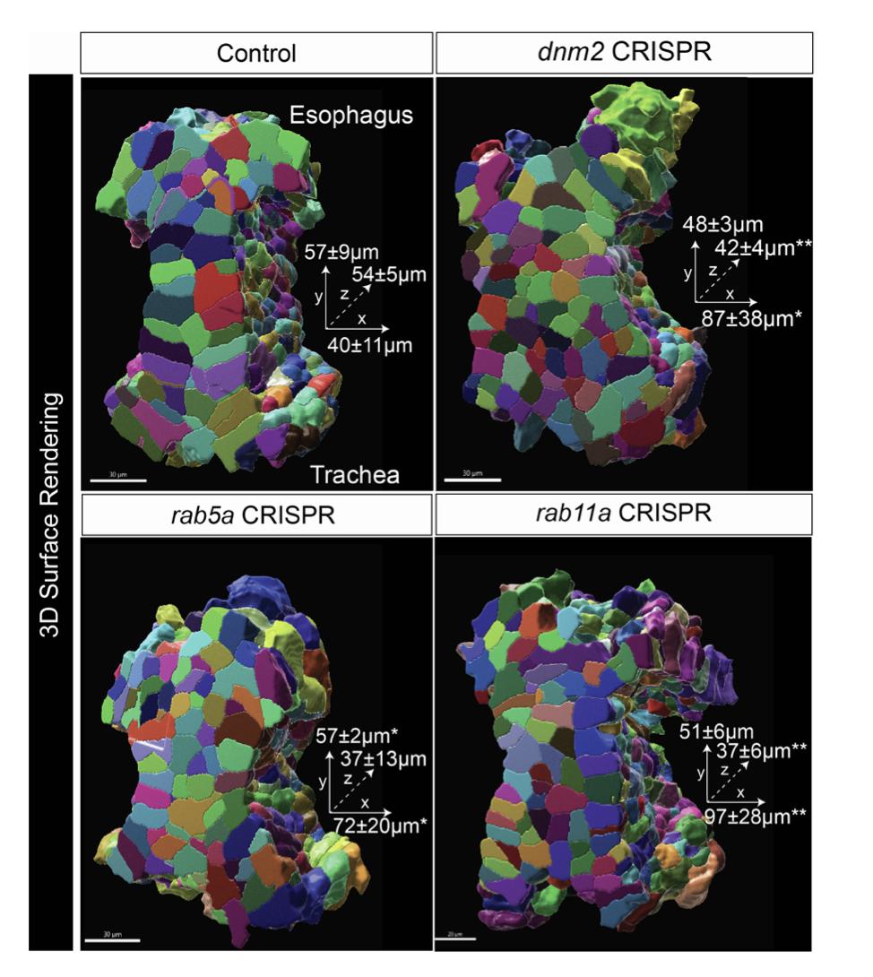 (C) dnm2, rab5a, and rab11a CRISPR mutants exhibit TEFs and blisters in the TE septum (asterisks). Scale bars, 50 um.