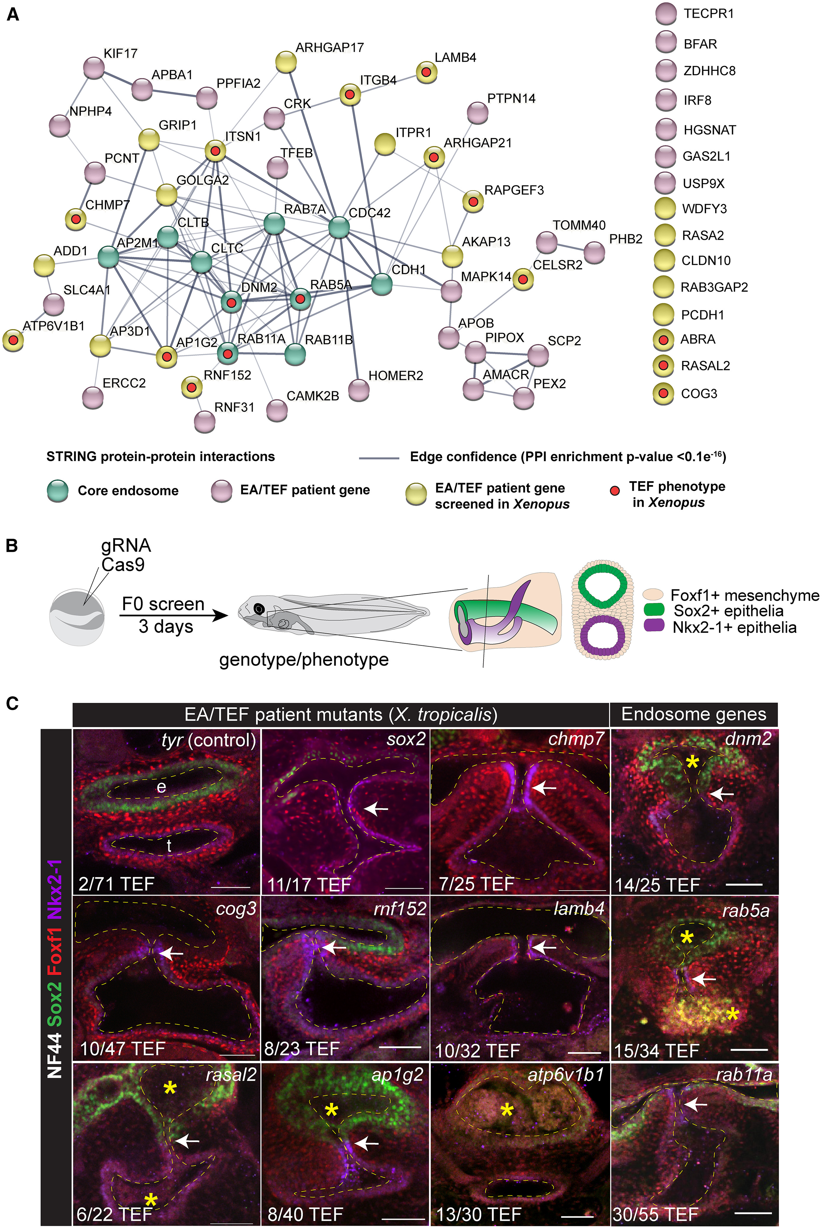 (A) STRING database interactome of endosome-related proteins with potentially pathogenic variants identified in EA/TEF patients and a curated list of core endosome pathway proteins and putative protein cargo.