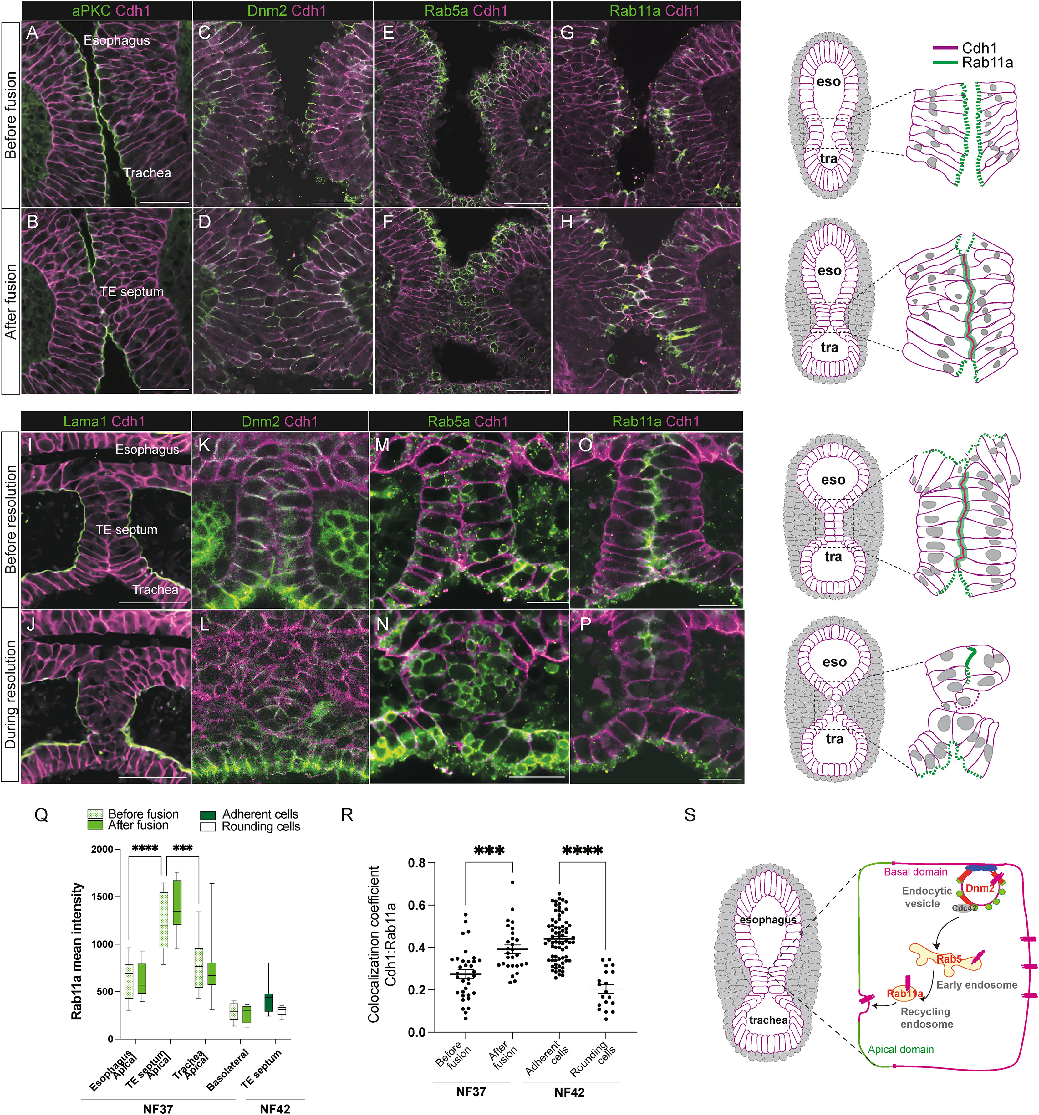 (Q) Quantification of Rab11a immunostaining intensity during foregut fusion and separation (mean min/max, 2W-ANOVA, p < 0.0001, n = 46 embryos analyzed).