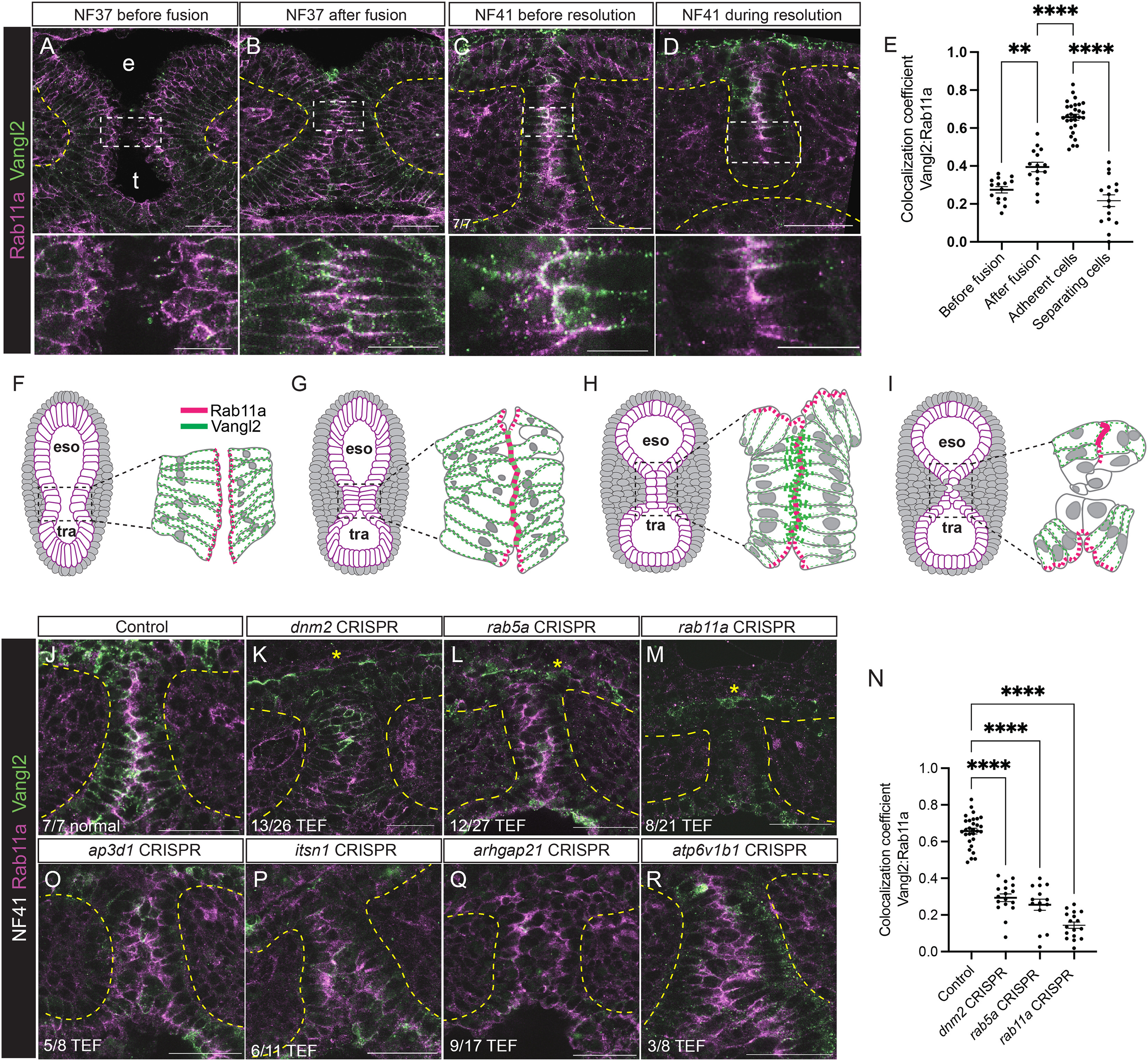 (AD) Time course of Vangl2-Rab11a immunostaining during Xenopus tracheoesophageal separation. Scale bars, 50 um and 20 um (inset).