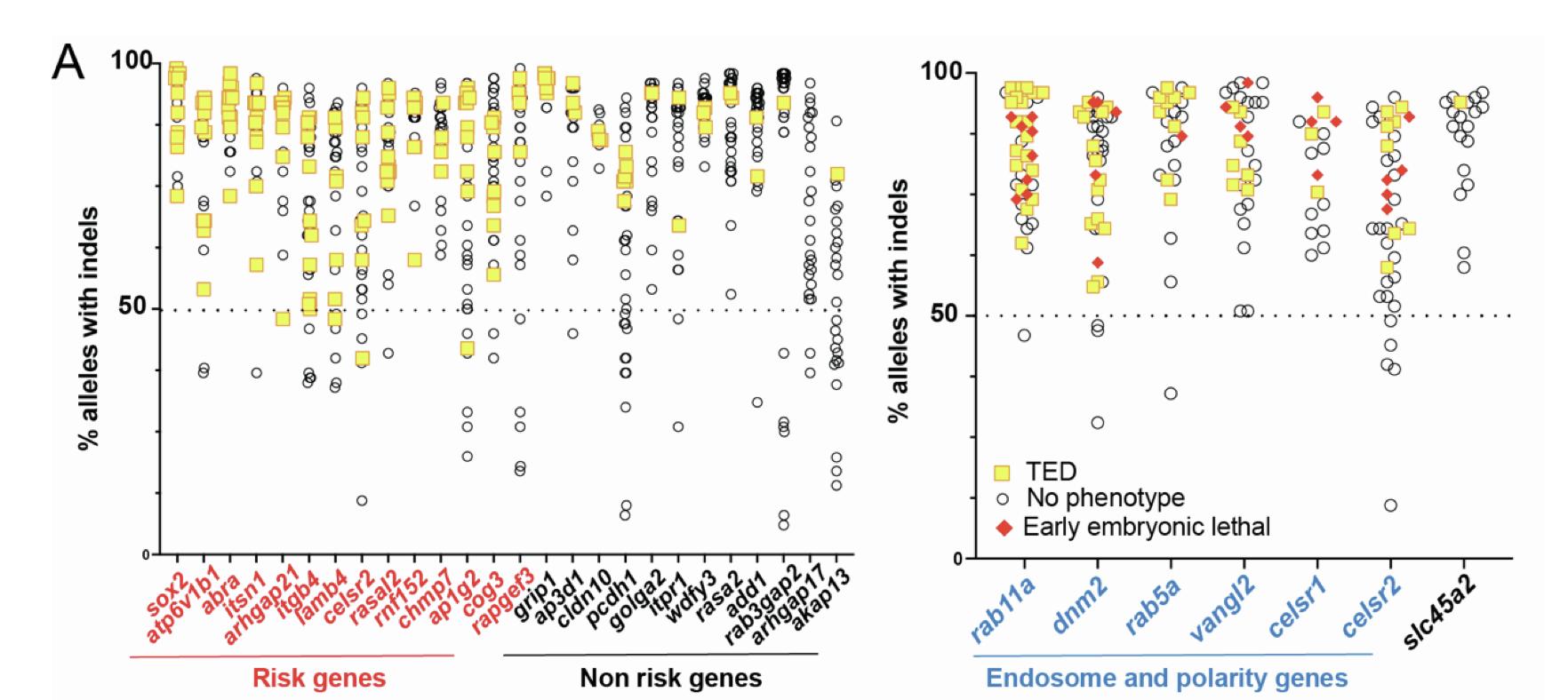 S1A Left: XY graph demonstrating correlation between editing efficiency (% alleles with indels) and phenotype penetrance