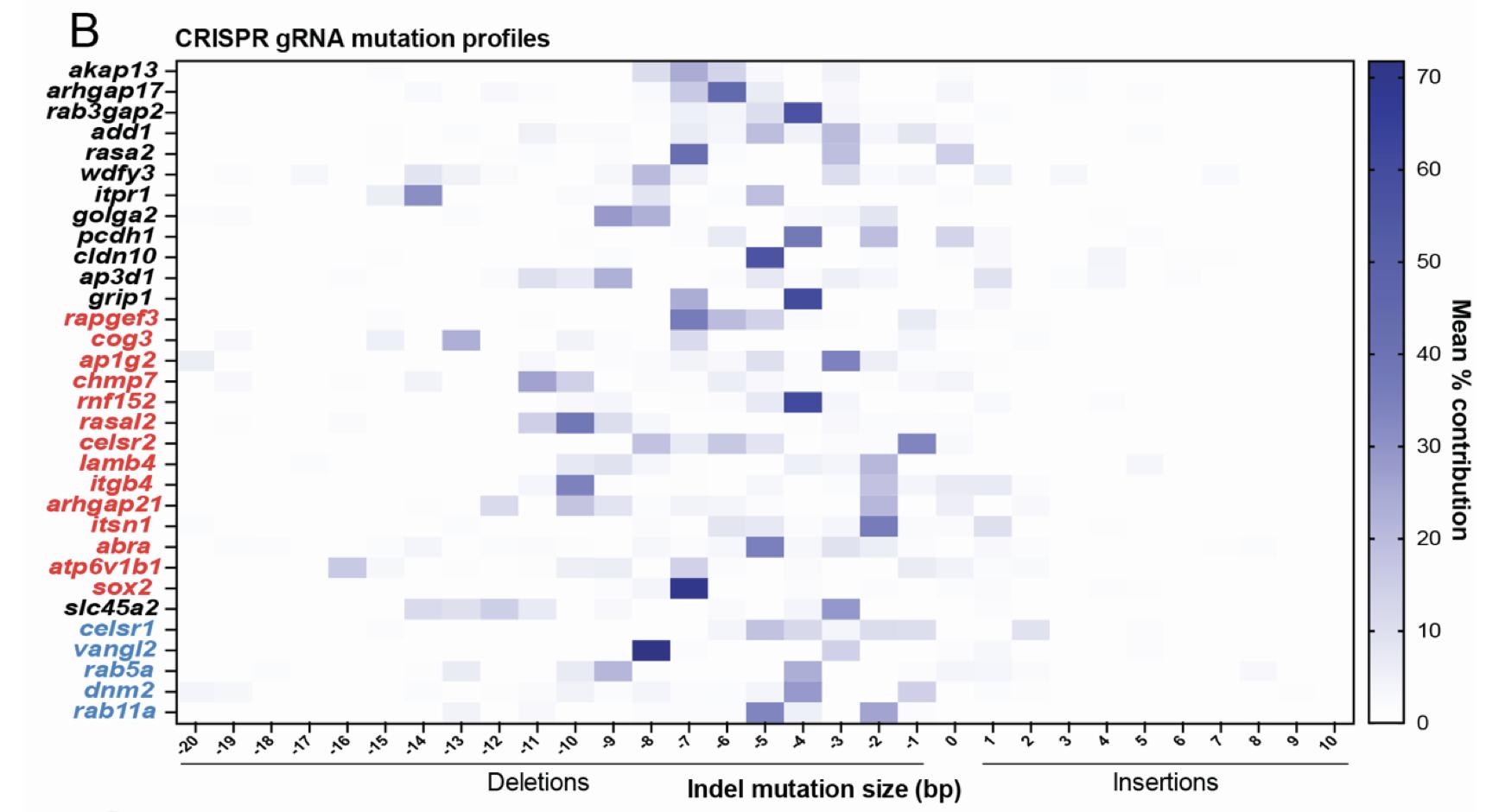 S1B: Heat map displaying the types of indel mutations generated by the indicated gRNA in F0 embryos, mean of n=5-15