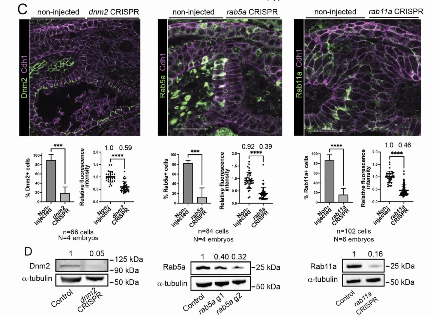 S1C: Immunostaining and confocal microscopy of unilaterally-injected tadpoles at the 2-cell stage with dnm2, rab5a, or rab11a CRISPR reagents and quantification of reduced number of protein-expressing cells and protein abundance on the injected side of the tadpole compared to the control, non-injected side. Graphs are mean SEM, ***p<0.001, ****p<0.0001 Students t-test, numbers above dot plots are the mean.
