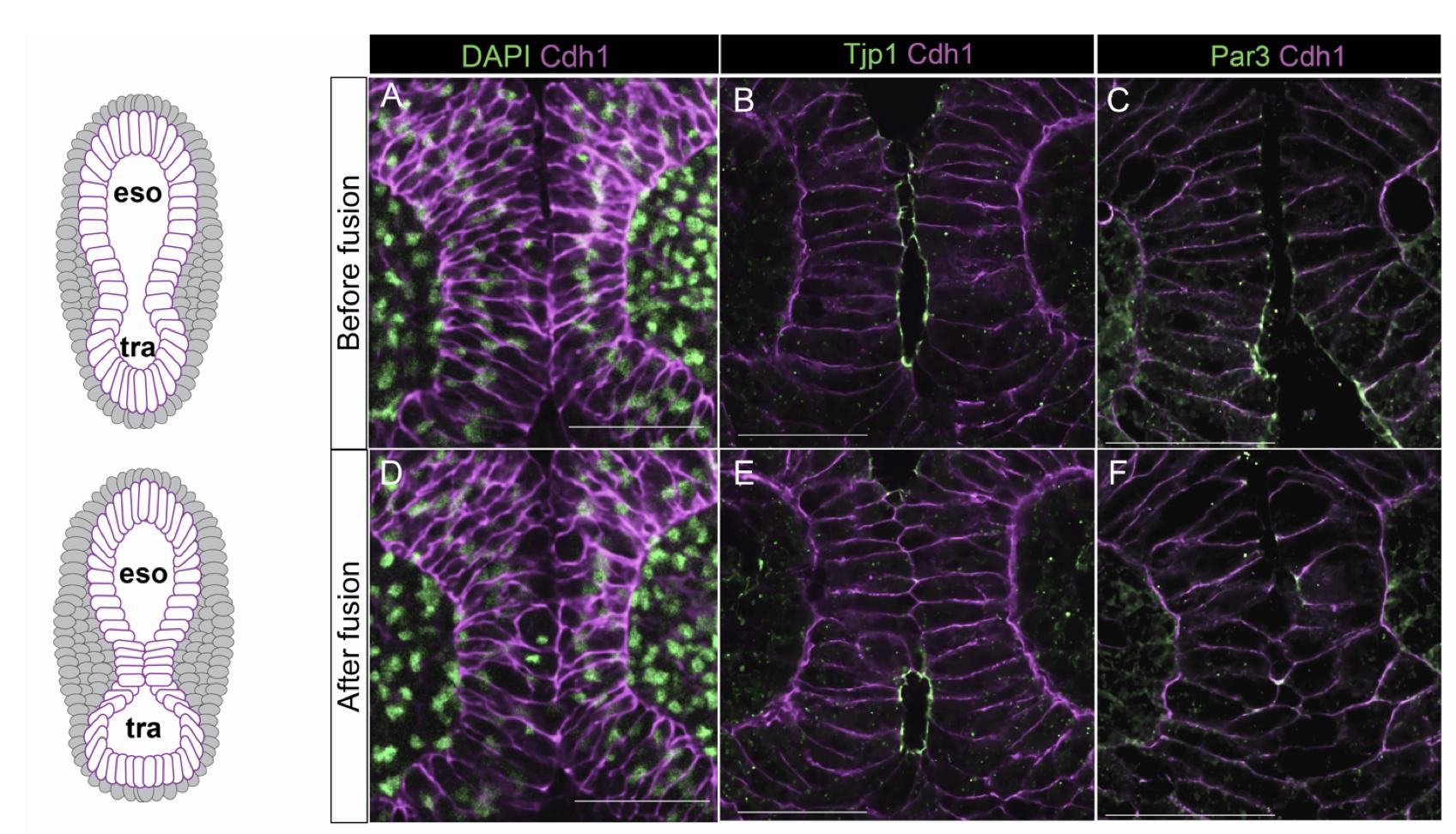 S2D-F: After apical fusion, epithelial cells remodel to localize E-Cadherin (Cdh1) apically and downregulate Tjp1 and Par3.