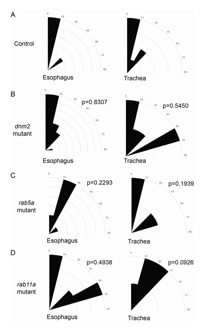 Figure S4. Mitotic spindle angles are not significantly changed compared to controls in the trachea and esophageal epithelia of endosome mutants, related to Figure 5.